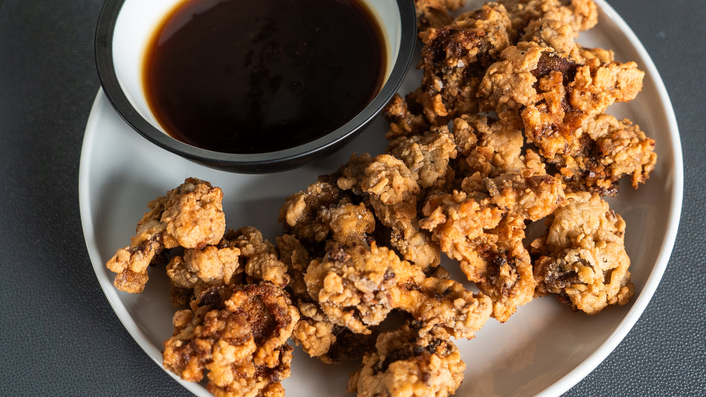 Working a few at a time, coat the mushrooms in the dredge, shaking off the excess. Fry for 3–4 minutes, or until the mushrooms are browned and crunchy. Retrieve with a slotted spoon or spider strainer, and allow to drain over a rack. Season with salt, and serve with the sauce.